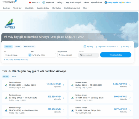 - Mã khuyến mãi và ưu đãi ngân hàng: Traveloka thường tung mã giảm 5–15% cho các chuyến bay nội địa và quốc tế, trong đó có Bamboo Airways, đặc biệt trong các dịp đặc biệt như Black Friday, 11/11, 12/12.